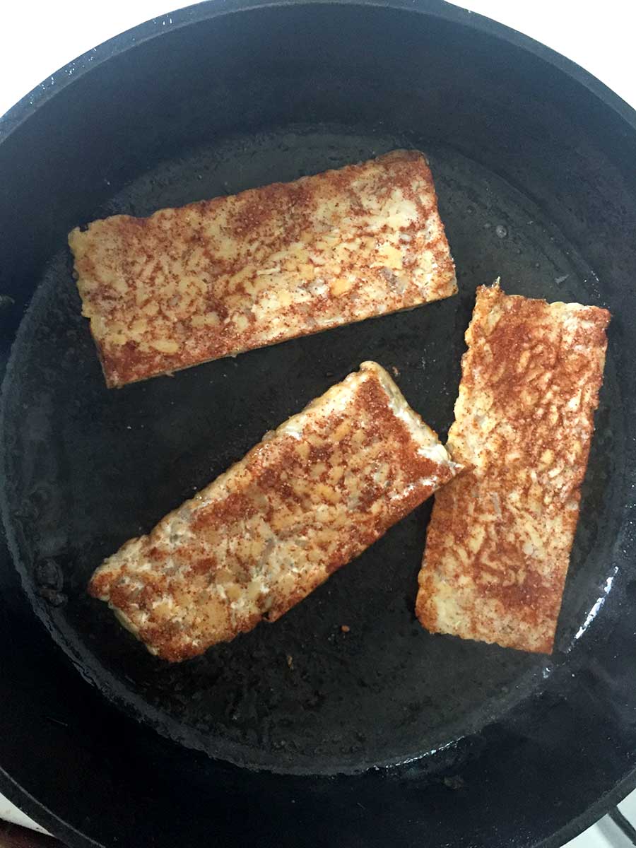 - Make sure pan is HOT. Add the spiced tempeh blocks to the pan and cook for about 1-2 minutes on each side.